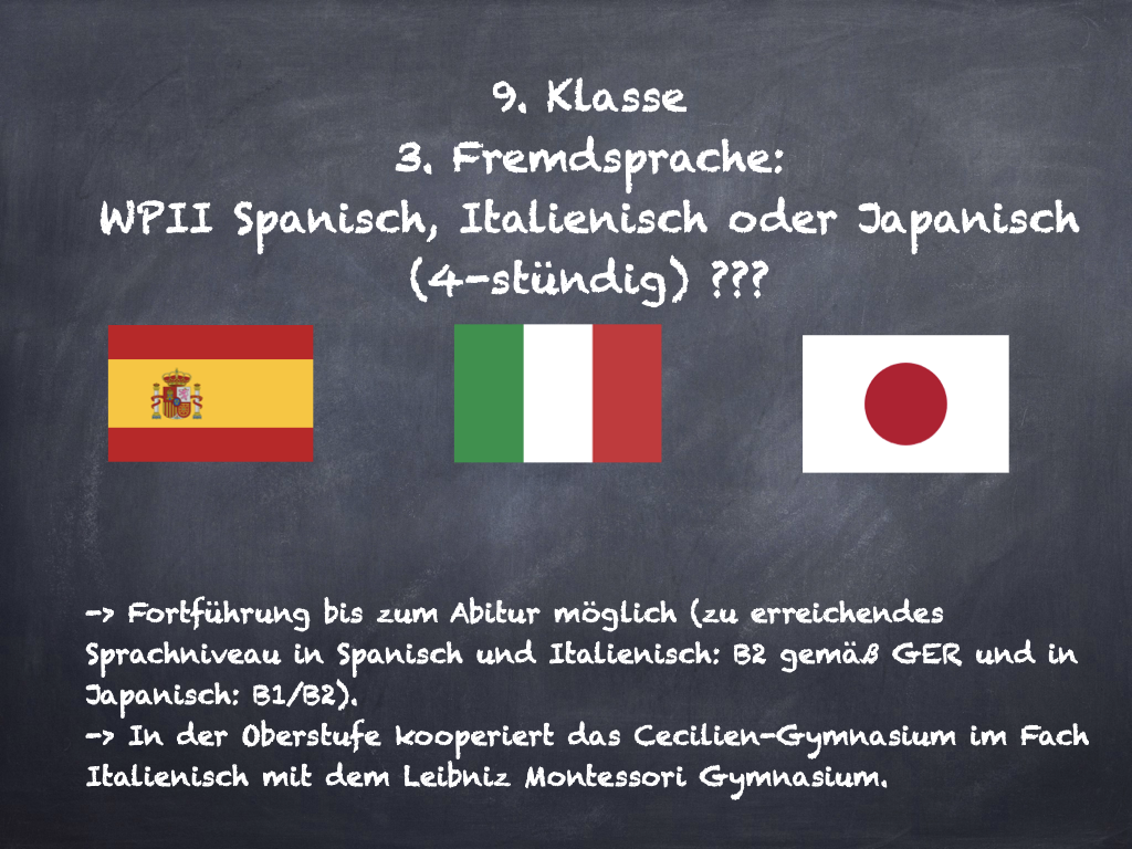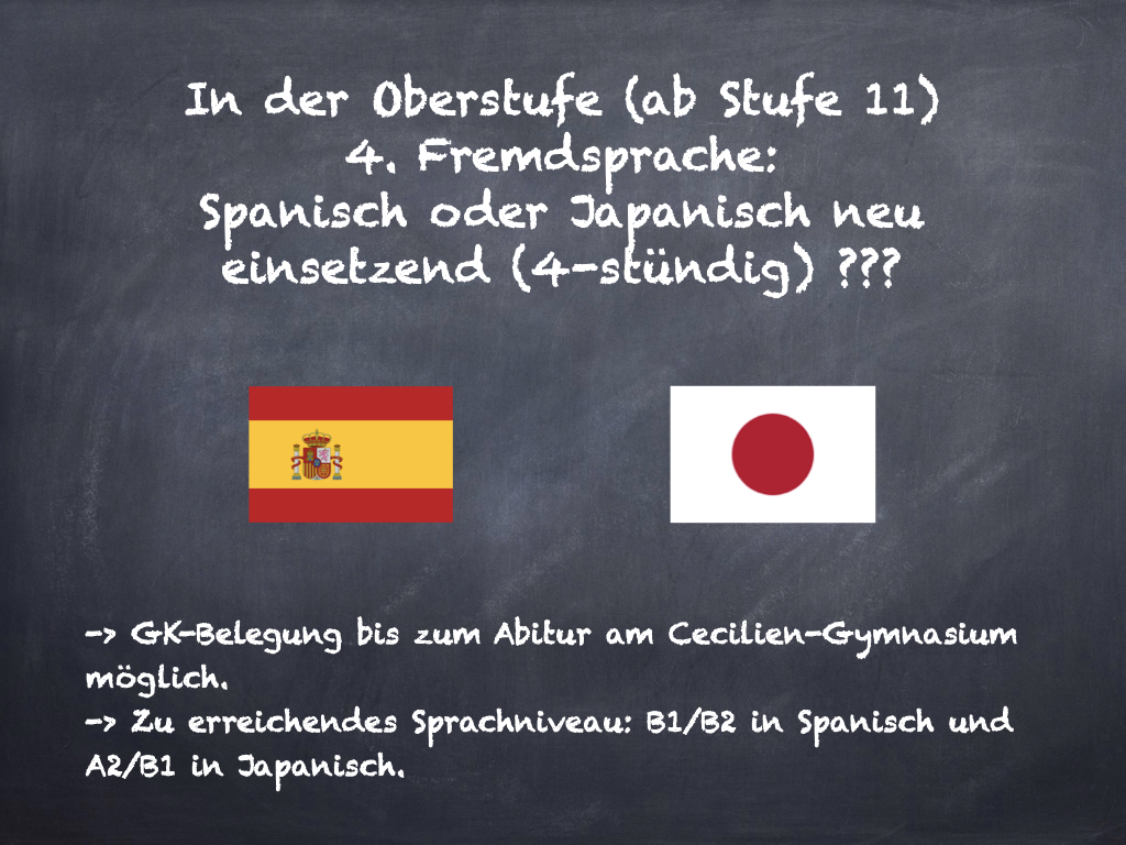 Wenn ihr mal aufs Ceci geht, könnt ihr Japanisch in der neunten Klasse als dritte Fremdsprache wählen. Im ersten Jahr Japanisch lernt ihr schon viele praktische Dinge, die ihr in Geschäften in Düsseldorf oder auch auf einer Reise nach Japan gebrauchen könnt. Ihr könnt dann zum Beispiel in einem Geschäft einkaufen oder in einem Café bestellen. Außerdem lernt ihr ganz viel über Japan, wie zum Beispiel: Welche großen Städte und Regionen gibt es außer Tokyo und was gibt es in Japan zu sehen und zu erleben? Welche Feste feiern die Kinder und Jugendliche in Japan? Natürlich lernt ihr auch die japanische Schriften ひらがな (Hiragana) und カタカナ (Katakana), damit ihr z.B. Manga mit Hiragana-Lesehilfe lesen könnt!